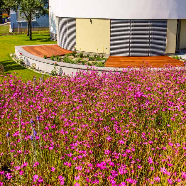 Pro střešní zahrady volíme speciálně namíchaný substrát s vysokým obsahem vododržných látek, zajišťující zároveň lehkost a pevnou strukturu. Substrát léty nesesedá a nepřetěžuje nosné konstrukce. Pro vegetaci střešních rostlin je důležité, aby byly zajištěny co nejmenší výkyvy ve vlhkosti. Používáme systém folií, který vodu zadrží a zásobuje jí kořínky rostlin.